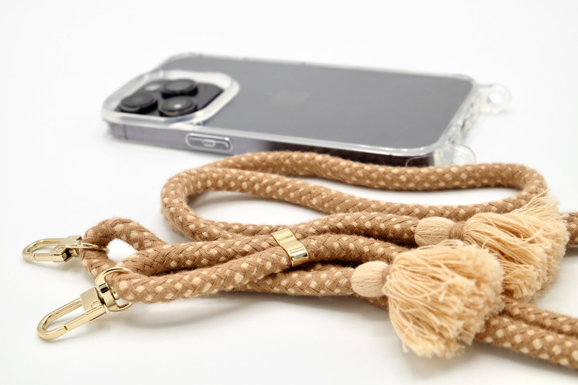 Hochwertige Handyhülle mit Ösen kombiniert mit einem stylischen, gewebten Baumwollseil mit 360° Karabinern zum blitzschnellen Einhaken an den festen Ösen der Handyhülle.