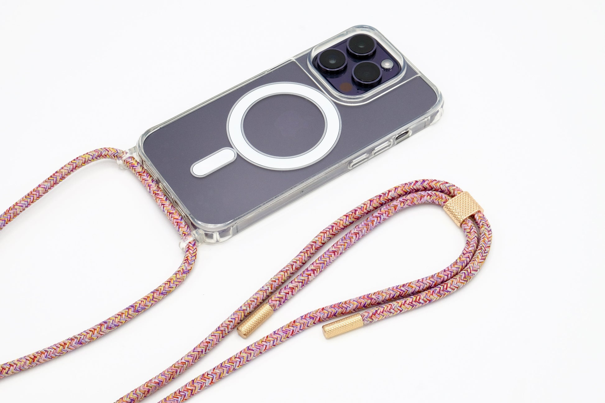 Hochwertige Handyhülle mit Ösen kombiniert mit einem weichen und anschmiegsamen Seil mit schraubbaren Endkappen zum leichten Wechseln.