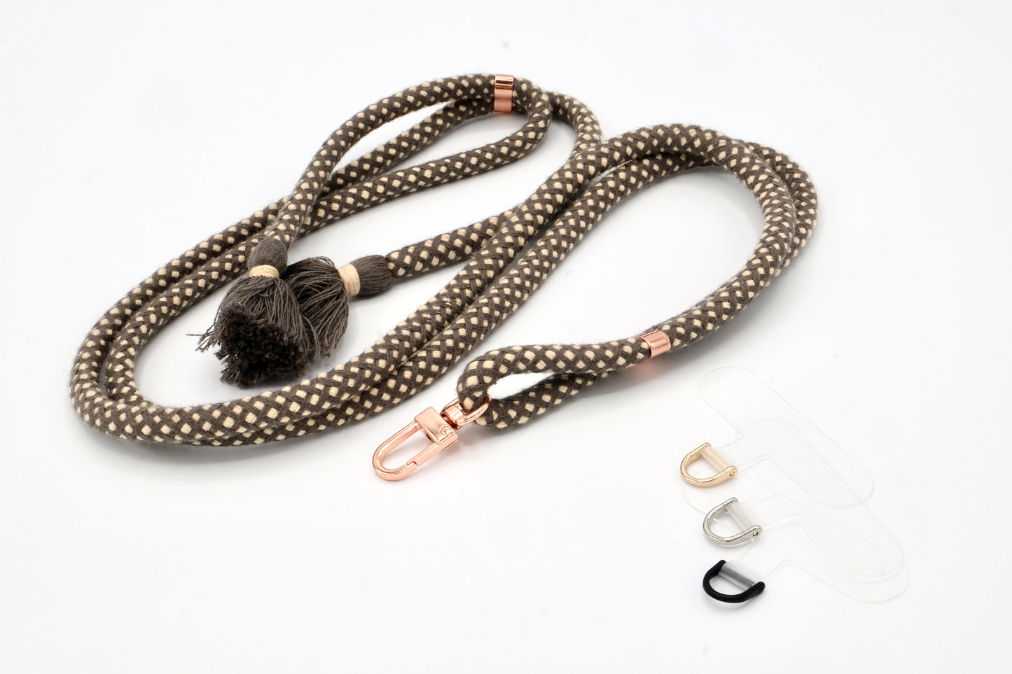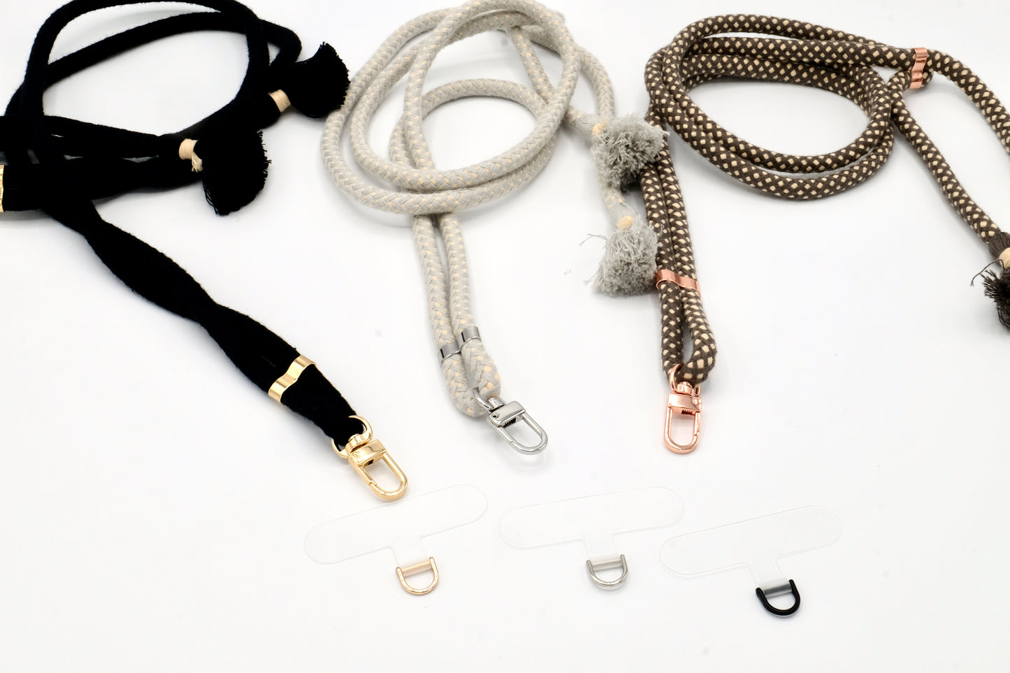 Entdecke unsere vielseitige Baumwollkordel mit Karabiner (und Patch) – verwandle jede geschlossene Handyhülle in eine trendige Handykette!